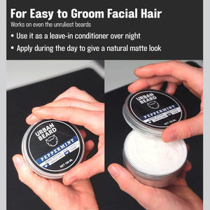 Urban Beard butter is a non-greasy moisturizer for your beard and skin. It will penetrate the hair follicle from the inside out, providing antioxidants and rich moisturization from the organic oils within. This results in full manageable facial hair and can be used on even the most unruly beards. It can be used as a leave-in conditioner over night or applied during the day to give you a natural matte look as if you've not applied product at all.
